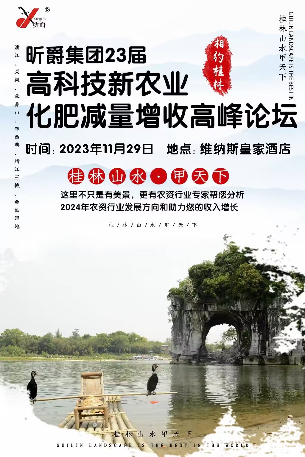 昕爵集团高科技新农业“化肥减量增收”高峰论坛,即将于2023年11月29日在美丽的桂林召开,会议邀请了行业***人士,将与参会人员共同探讨2024年农资行业的发展方向和前景,并有机会与新媒体大咖交流如何利用抖音引流、将生意做大做强。