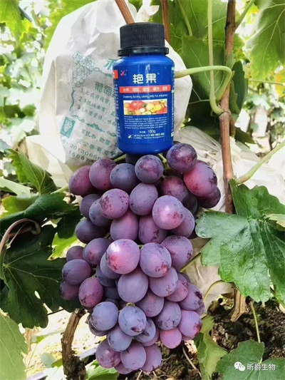 产品性能:本品由天然脱落酸,天然茉莉酸,生物果实诱色剂,色氨酸,类胡萝卜素、有机钾及多种大中微量元素螯合而成,配方科学稳定、持效期长,不会出现脱粒、落叶等副作用;在膨果期能促使果实快速膨大,在果实着色前期能促使果实快速着色,增加糖度,提高花青苷含量,提早上市,经过本品处理后的果实品质提高,增加储运性能。
