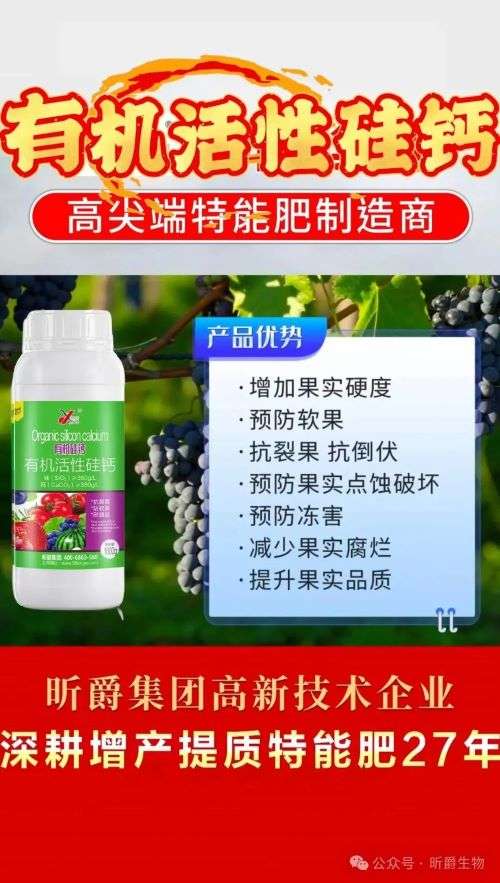 有机huo性硅钙核心优势在于其高huo性和良好的吸收性。huo性硅钙的组合,能够显著提高作物的生理机能,增强果实的硬度,从而有效预防软果现象。还能预防果实点蚀破坏,减少采收后果实的腐烂,延长果实的保鲜期,让农户们得到更好的回报。值得一提的是,“昕爵有机huo性硅钙”在提高果实品质的同时,还注重提升果实的外观卖相。使用后,果面整体外观更加诱人,光泽度增加,让您的农产品在市场上更具竞争力,实现提质增收的目标。此外,这款产品还具有出色的耐储运特性。在长途运输和储存过程中,它能够有效保护果实免受外界环境的侵害,减少损耗,确保农产品的新鲜度和品质。